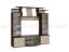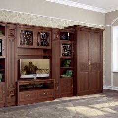 Актуальная модель с большой нишей под TV. Фасады шкафов окрашены в разные цвета. Стеклянные дверцы стеллажей декорированы растительным узором. Роскошный вариант для стильного интерьера.